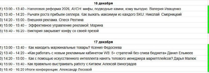 Если вы продаёте на WB и хотите зарабатывать больше, а не “угадывать”, вам надо на предстоящую конференцию, которая пройдет 16 и 17 декабря! Что будет: 📌 2 дня практики 📌 Разборы, цифры, реальные кейсы 📌 Спикеры — действующие селлеры и эксперты 📌 Без воды и мотивационных сказок На скрине - график выступлений спикеров! Чтобы получить доступ ко всем материалам и не пропустить старт — вступайте в группу конференции: https://t.me/+0hCcyHvlkJsxMTc6 Старт уже 16 декабря. В группе — вся орг-информация, напоминания и записи. Спикеры: Александр Лесовой Виктория Поснова Николай Смерницкий Алексей Виноградов Валерия Иващенко Дарья Малюк Данил Ельмеев Олеся Рехтина