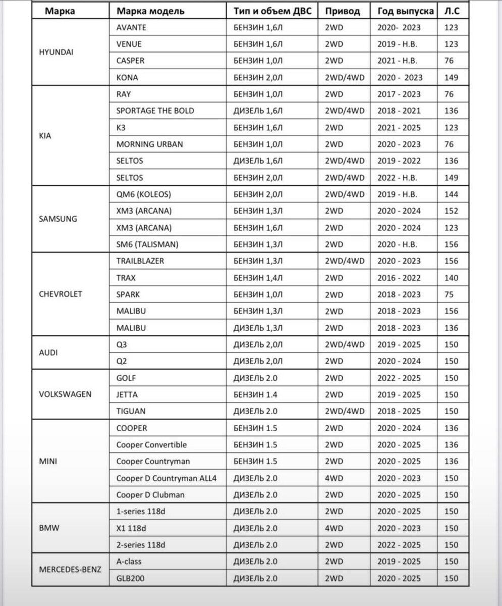 Список авто из Кореи , которые не попадают под утилизационный сбор