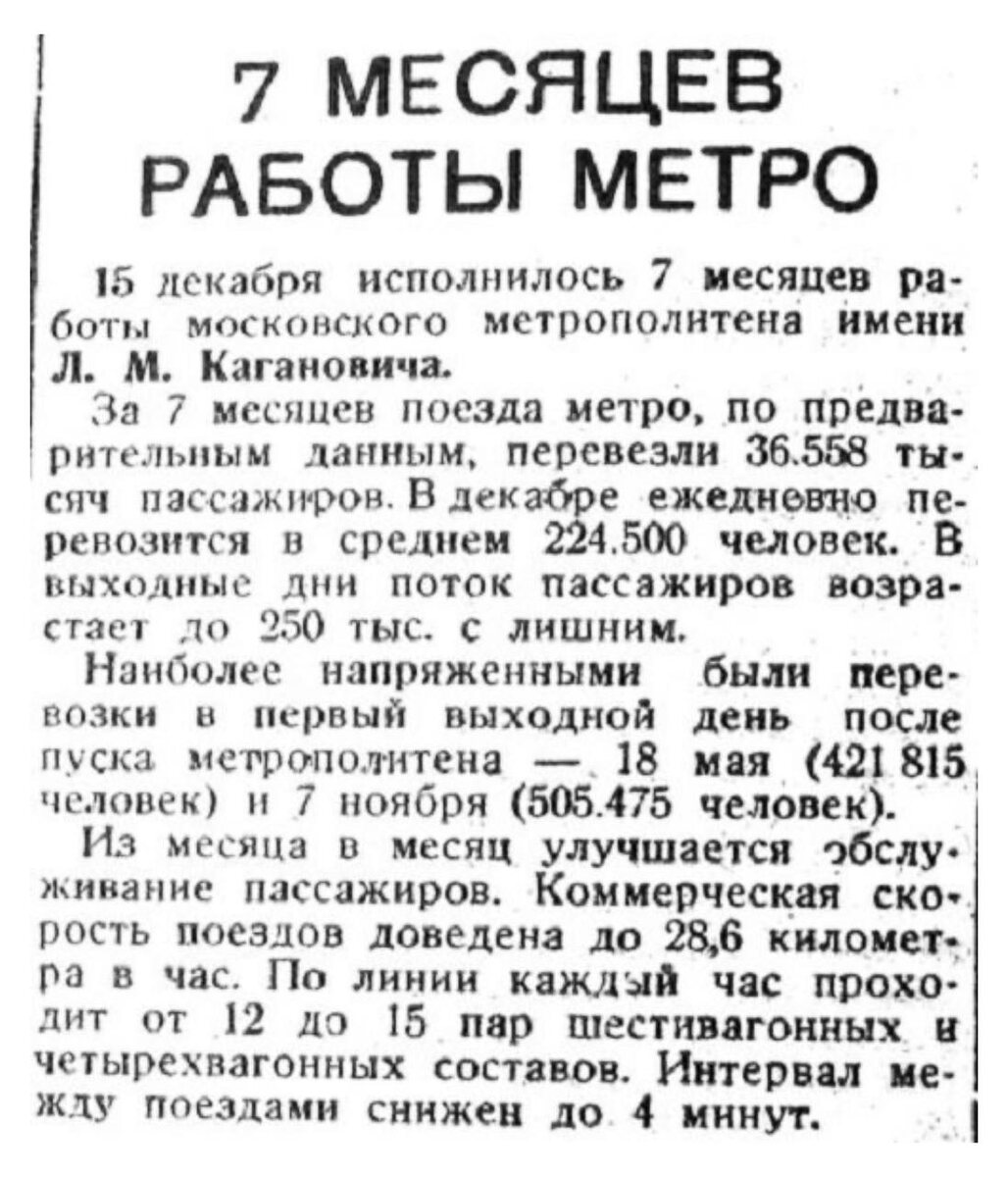 16 декабря 1935 года в газете «Гудок» вышла информация со статистикой о первых 7 месяцах работы Московского метро
