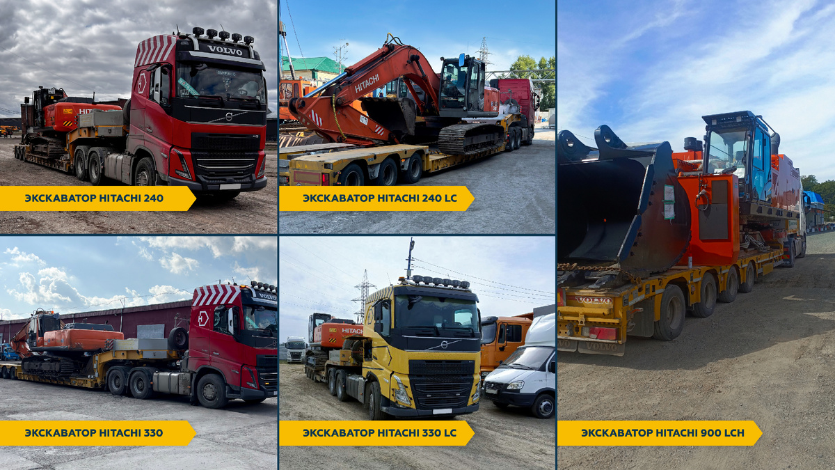 Эти экскаваторы мы регулярно катаем по разным регионам. Сегодня покажем несколько свежих перевозок. — ZX240 и ZX240 LC — по 24 т каждый. Работали сцепкой Volvo 6×4 и 3-осным корытом. — ZX330 и ZX330 LC — по 33 т. Один шел на 3-осном трале, другой — на 4-осном с уширителями. — ZX900 LCH — тяжеловес. Перевозили отдельно тело и ковш на Volvo с 4-осной платформой.