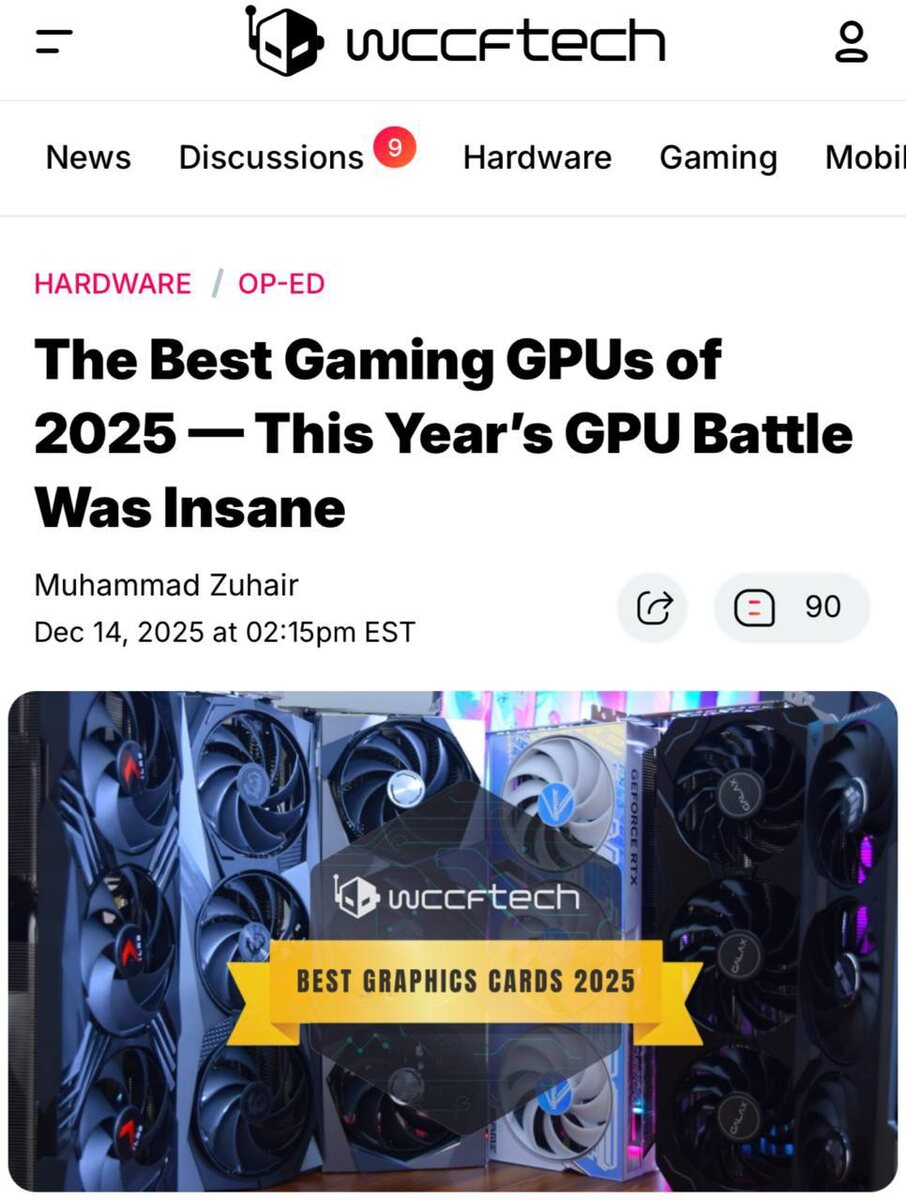 Wccftech собрал топ видеокарт 2025 года мини-шпаргалку для желающих обновиться. Из главного: • NVIDIA GeForce RTX 5090 флагман года; • AMD RX 9070 XT лучший ун иверсальный выбор; • AMD RX 9060 XT (16 GB) топ среди бюджетных; • NVIDIA RTX 5070 оптимум по балансу цены и мощности; • Intel Arc B580 почётное упоминание за смелость. Ждём снижения цен и обновляемся. CtrlAltDelights- подписаться
