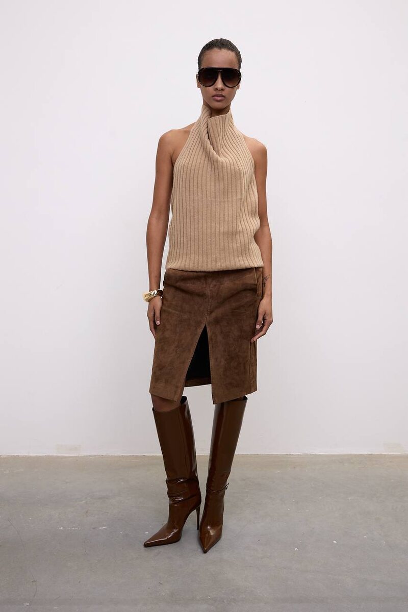 Один из самых эффектных топов сезона: высокий воротник и открытые плечи