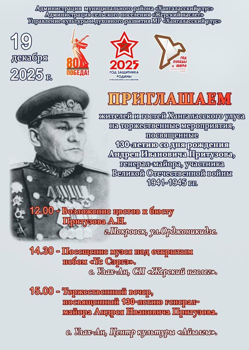 19 декабря 2025 года в Хангаласском улусе состоятся торжественные мероприятия, посвященные 130-летию со дня рождения Андрея Ивановича Притузова, генерала-майора, участника Великой Отечественной войны. @Новости газеты «Хангалас»