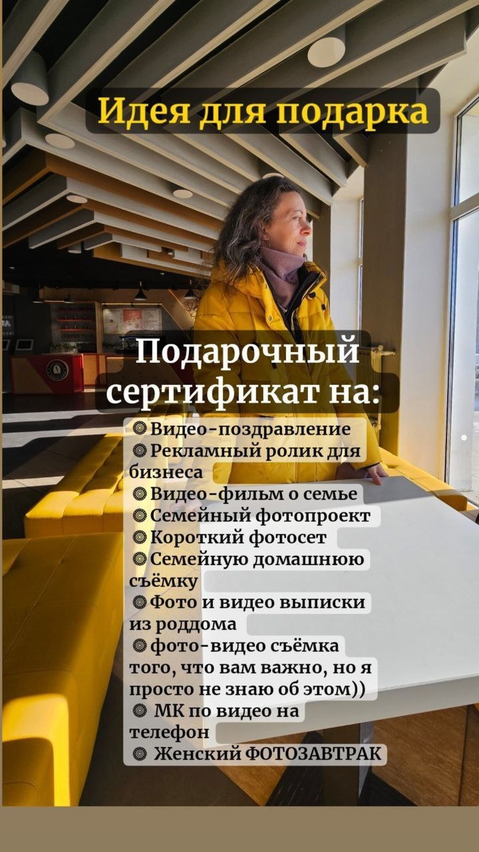 ▶️/ 📸 ПОДАРКИ К ПРАЗДНИКУ В декабре, январе, феврале у людей случаются дни рождения! А ещё случаются разные новогодние и местечковые праздники. Моя работа часто бывает подарком кому-то по какому-то поводу: от выписки из роддома до 8марта или "Наконец-то они приезжают! " Поэтому, перечислю для вас то, что вы можете подарить своим родным, друзьям или коллегам по работе, заказав ПОДАРОЧНЫЙ СЕРТИФИКАТ: 〰️Видео-поздравление (об этом подробно здесь) 〰️Рекламный ролик для бизнеса (про это есть здесь) 〰️Видео-фильм о семье (рассказала тут) 〰️Семейный фотопроект (подробности здесь) 〰️Короткий фотосет (сюда за ценами и вариантами) 〰️Семейную домашнюю съёмку (на сайте подробно расписано) 〰️Фото и видео выписки из роддома (тык сюда и посмотреть) 〰️фото-видео съёмка того, что вам важно, но я просто не знаю об этом)) 〰️МК по видео на телефон (подробности здесь) 〰️Женский ФОТОЗАВТРАК (есть целая группа про это) Все ссылки синим текстом кликабельны. Сертификат оформляю на конкретное имя. Срок д