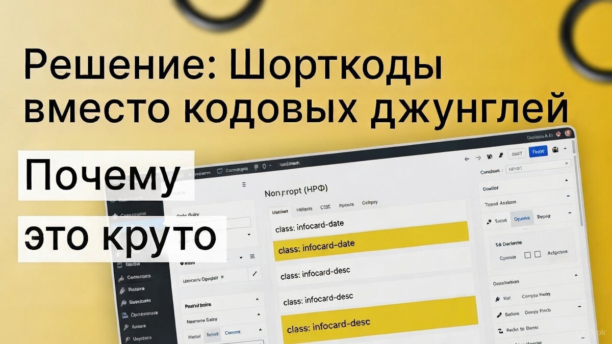Оказывается, в шаблоне уже заложен механизм: контейнер с определённым классом (в нашем случае infocard-date) автоматически подсвечивается жёлтым. Оставалось лишь «научить» систему применять этот класс к нужным датам. Решение: шорткоды вместо кодовых джунглей