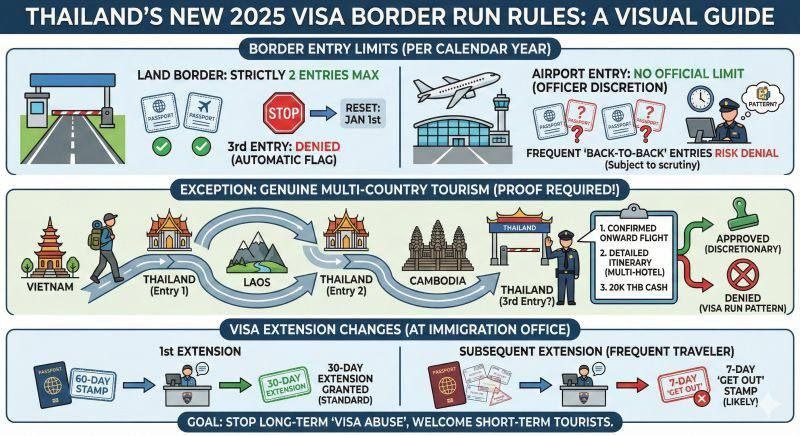 Буквально пару дней назад прошли непонятные новости про правила въезда в Таиланд - советую всем зимовщикам и путешественникам следить за ситуацией. Мы об этом узнали через визовый чат Travelask. Ещё с месяц назад Таиланд резко ужесточил правила въезда - прилагаю инфографику. Однозначно известно, что продления безвизовых штампов ограничили до 1 в год. То есть вы теперь не можете продлить каждый штамп на 60 дней ещё на +30 сверху. При попытке продлить второй и более штамп вам поставят 7 дней - отказ и разрешение покинуть страну, за те же 1900 бат (50$). Позавчера внезапно депортировали 30 человек, среди которых у некоторых это вообще был первый въезд. Также компании, продающие "зелёные коридоры" - гарантированный въезд со взяткой - перестали брать в качестве клиентов украинцев и россиян. Якобы это связано с возможной военной поддержкой то ли Украины, то ли РФ для Камбоджи. Помимо этого, влетать советуют исключительно через аэропорт Суварнабхуми, а не Дон Мыанг. Также были сообщения о