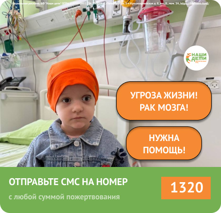 Прямо сейчас очаг РАКа прогрессирует, лишая Лизу зрения и жизни! Спасти малышку готовы за рубежом. Многодетной семье не оплатить спасение доченьки без Вашей помощи! УГРОЗА ЖИЗНИ! РАК МОЗГА! ПОМОЧЬ ЛИЗЕ ПО ССЫЛКЕ > Здравствуйте, дорогие помощники! Лиза ещё так мало успела рассмотреть в этом мире: яркость красок, улыбку мамы, первую снежинку на рукаве. Но прямо сейчас в зрительном нерве и стволах её черепа тихо и неумолимо растёт опухоль РАКа. Уже с начала осени этого года, после постановки диагноза, Лиза проходила лечение на родине в Центре детской онкологии, где ей было проведено 10 курсов химиотерапии. К сожалению, проведённое лечение не дало результата. Опухоль продолжает расти, а малышку продолжают мучить сильные боли. Понимая, что теряют дочь, родители решили обратиться в зарубежные клиники. Специалисты из Израиля дали маленькой Лизе шанс на выздоровление, но для этого требуется интенсивное лечение по тщательно выверенному протоколу. Многодетная семья отдала последнее, но денег хв