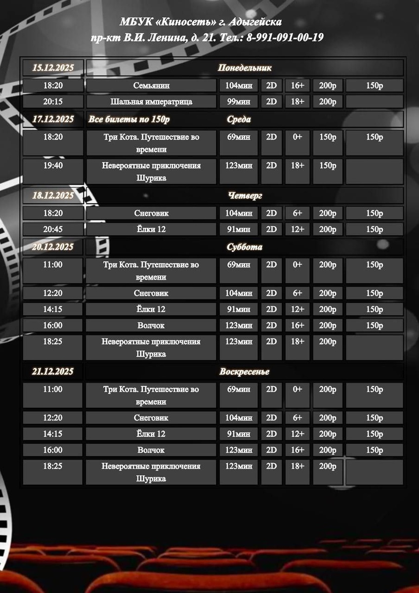 Расписание Кинозала г. Адыгейска с 15.12.2025 по 21.12.2025🎞 Купить билет онлайн можно по ссылке внизу 👇 https://clck.ru/32VTgE ___ Мы в социальных сетях👇 VK 🎞https://clck.ru/34TuU5 TG 🎞https://clck.ru/34TuU6 ОК 🎞https://clck.ru/3MdGRj 🎞WhatsApp: 8-991-091-00-19 📱8-991-091-00-19