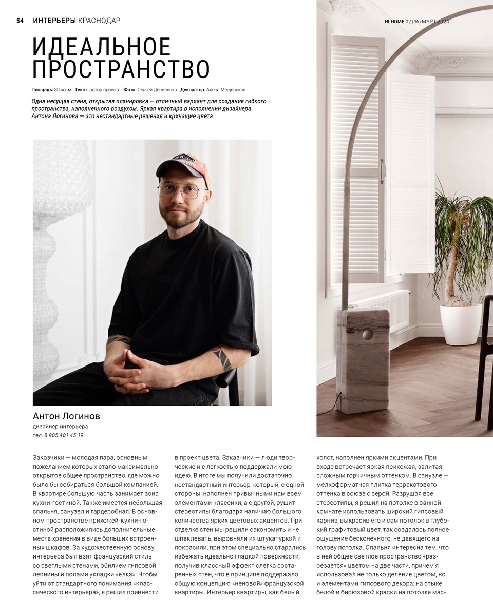 В номере «Главный цвет 2024: воздушный и пушистый Peach Fuzz» журнала «Hi home Краснодарский край» (март 2024) опубликован проект Антона Логинова «Идеальное пространство» Дизайнер: Антон Логинов