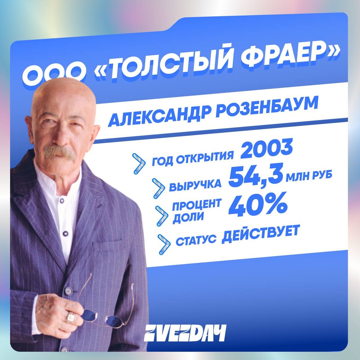 В 2003 году мечта наконец-то материализовалась: музыкант уверенно зашел в ресторанную сферу вместе с партнершей Надеждой Любиной, став владельцем ООО «Толстый Фраер». С тех пор сеть выросла до шести точек по Санкт-Петербургу, а концепция так и осталась ностальгической. Розенбаум лично участвовал в создании меню. Антураж в стиле кабака 80-х: бутерброд с салом, граненые стаканы, селедка и пиво в бидончиках, которое варят в собственной пивоварне. «Я люблю простую еду, ту, что ассоциируется у меня с детством. Например, макароны по-флотски или картошку с тушенкой. Это вкусно и сытно, полагаю, также считают и наши гости. Всю студенческую юность я провел в пивных барах. Сегодня я хочу, чтобы пивная снова стала местом досуга», — делился с журналистами Розенбаум. ООО «Толстый Фраер» существует больше 20 лет. Любина — гендиректор и владелец 50% доли, у Розенбаума — 40%, остальные 10% — у Анны Чаки. Сотрудники работают стабильно, алкогольная лицензия имеется. Какая песня без баяна. В 2024 году в