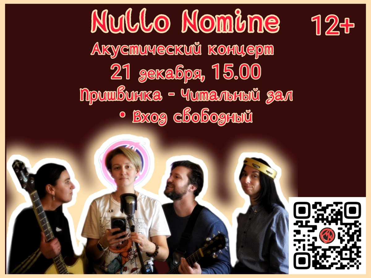 Мы всё думаем, чего нам не хватает перед Новым годом? Компания хорошая – есть, книги – есть, настроение – присутствует. Ещё бы не помешало добавить классной музыки. 🎶 В это воскресенье ждём вас на концерт орловской музыкальной группы Nullo Nomine. Nullo Nomine – творческий проект Марии Тимофеевой. Появился коллектив в 2006 году под названием Glaz Buri. Современный состав коллектива включает четырёх музыкантов, исполняющих композиции лидера группы. Творчество Nullo Nomine отличается самобытностью и эмоциональной насыщенностью. Концерт и живое общение с музыкантами зарядят вас позитивной энергией в преддверии зимних праздников. 👍 Не пропустите! Пришвинка 21.12.25 в 15:00📖