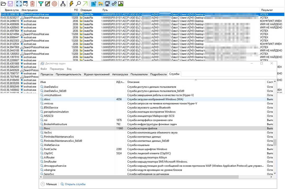 В чате поддержки Константин пожаловался, что какое-то приложение копирует на сетевой диск файлы из профиля пользователя. На этот случай у меня есть #классика блога: Видео: Process Monitor - как отследить приложение, записывающее непонятные файлы на диск. Procmon не подвёл, но обнаружился нюанс. Приложением оказался системный процесс svchost. Опытным взглядом можно было и по путям файловой системы догадаться, что происходит. Но зачем гадать, если можно определить достоверно. ⌛️ Когда-то процессов svchost было лишь несколько, и под каждым хостилось много служб. Но в 2016 году большинству служб выделили отдельные процессы. Комментируя нововведение, я отметил четыре преимущества, в том числе упрощение диагностики. В логе Process Monitor у каждого процесса есть идентификатор, PID. Всего лишь нужно: 1. Открыть диспетчер задач на вкладке Подробности 2. Найти процесс по ИД 3. ПКМ - Перейти к службам, и связанные с процессом службы будут выделены ✅ Вот так мы и вычислили историю файлов! В