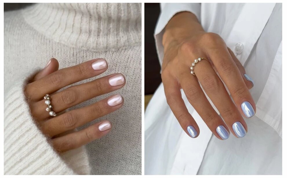 Перламутровое покрытие — это универсальный нюд в необычном прочтении, а еще любимый маникюр Хейли Бибер. Зимой такой маникюр смотрится особенно органично: он напоминает снег, иней и перламутровый блеск льда.