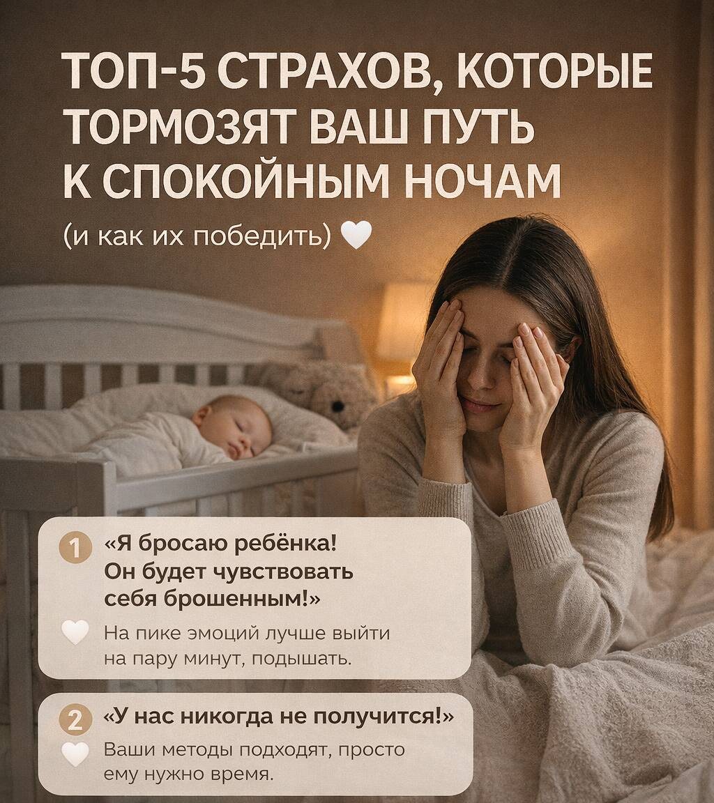 ТОП-5 страхов, которые тормозят ваш путь к спокойным ночам (и как их победить)🤍 Фраза "спит как младенец" звучит как мечта, но для многих родителей она — ирония. Бессонные ночи, тревога, слезы... Наши страхи часто мешают найти путь к здоровому сну. Часто мы боимся навредить, испортить, сделать что-то "не так". Давайте разберем 5 самых распространенных страхов, которые мешают нам и нашим детям наслаждаться полноценным отдыхом, и посмотрим, как их развеять. 🤍 "Я бросаю ребенка! Он будет чувствовать себя брошенным!" — это, пожалуй, самый сильный и болезненный страх, который останавливает многих мам. Кажется, если малыш плачет, когда вы уходите из комнаты, вы совершаете предательство. Но это не так. Иногда на пике эмоций лучше положить ребёнка в кроватку и выйти на пару минут, подышать, и вернуться с новыми силами. Это лучше, чем навредить. 🤍 "У нас никогда не получится! Мы обречены на бессонницу." — эта мысль может посетить, когда после нескольких попыток ничего не меняется, или к