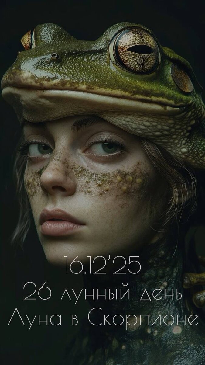 16.12’25 26 лунный день Луна в Скорпионе Когда Луна 🌙 заходит в знак Скорпиона ♏️, атмосфера становится напряжённой. В этот период эмоции бурлят внутри, но часто остаются незамеченными снаружи, а люди склонны подавлять чувства или выражать их косвенно, через пассивную агрессию. Может появиться желание «копаться» в чужих слабостях, находить больные точки и неосознанно на них давить. При этом сами люди редко готовы признать собственные эмоции. Им кажется, что они «не такие», слишком резкие или неуместные. Из‑за этого нередко страдает психосоматика: подавленная агрессия, например, может проявляться в сжатой челюсти или головных болях. Если на это время выпадает 26 л.д, ситуация усложняется. Символ дня: жаба, болото, омут, трясина Сейчас легко увязнуть в иллюзиях, самодовольстве и токсичных мыслях. Этот день считается непростым: настроение скачет от эйфории к унынию, слова вылетают импульсивно и быстро забываются, а обещания и клятвы не имеют веса. Жаба, как образ, напоминает о о