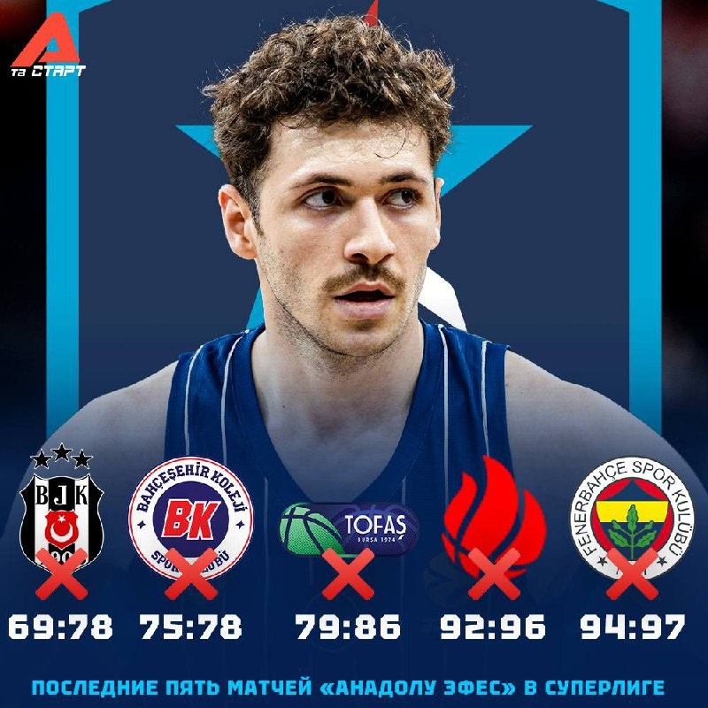 😪 Рекордная серия неудач в истории «Анадолу Эфес» До этого момента команда никогда не проигрывала в пяти матчах подряд турецкой Суперлиги. А ведь клубу почти 50 лет… Прервется ли эта череда неудач — узнаем в воскресенье. Команда сыграет против «Галатасарая» в 13:00, а мы это дело покажем на телеканале «Старт Баскет» 📺 Подписывайся на ТВ СТАРТ в MAX📲