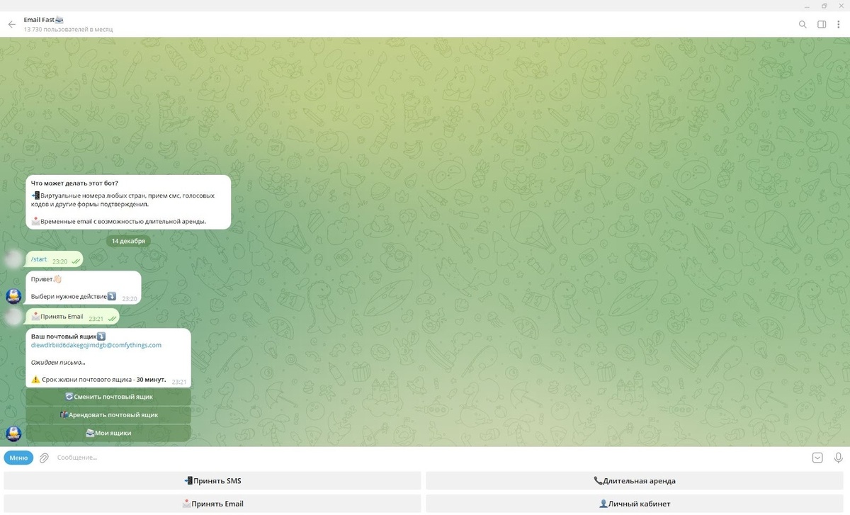 Особенности: этот бот позволяет генерировать почту прямо в мессенджере. Письма приходят туда же — в чат с ботом. Это идеальный вариант для быстрой регистрации в приложениях. Вы можете даже отвечать на письма (что редкость) и удалять ящик по команде.