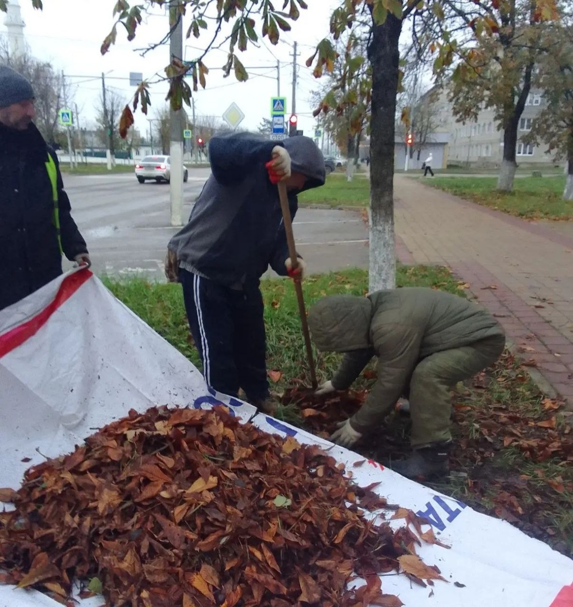 Сотрудники учреждения занимаются уборкой опавшей листвы.