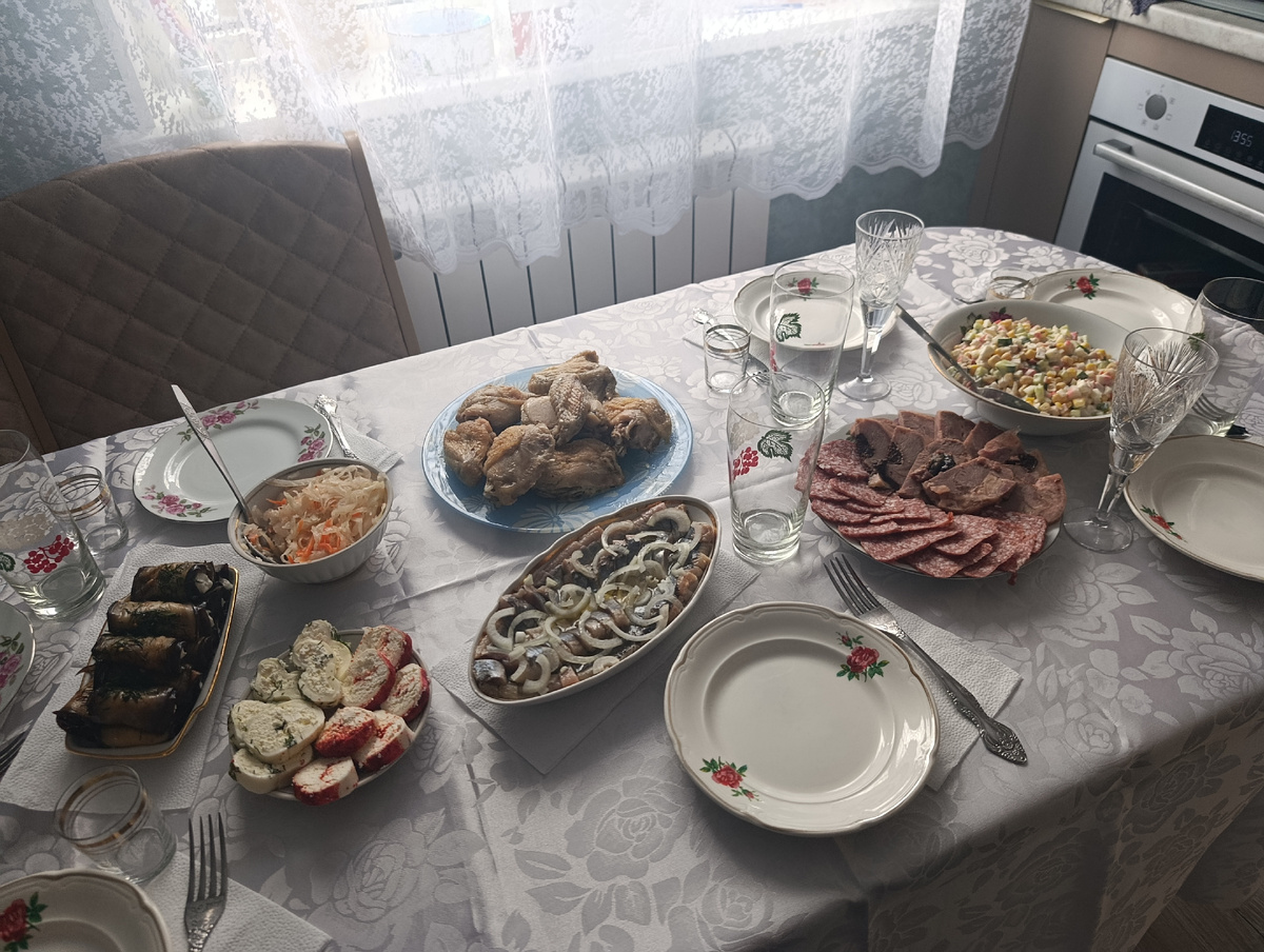 В воскресенье у меня был день рождения. Пышных торжеств не устраивала, пригласила только родителей и свекров, собрала скромный обед. Покажу, чем угощала. Для начала, как обычно, общее фото стола Как видите, всего по чуть-чуть. Покажу поближе и расскажу поподробнее. Салат: крабовые палочки, свежий огурец, яйца, консервированная кукуруза, майонез Квашеная капуста Рулеты из сулугуни с творожным сыром. Один из них с укропом, второй со сладкой паприкой Рулеты из баклажанов с творожным сыром и чесноком Сельдь соленая Сырокопченая колбаса и рулет из утки с черносливом На горячее картофельное пюре и запеченая курица На десерт был чай с тортом P. S. Хочу поблагодарить @Elina_economka и за милые презенты😘