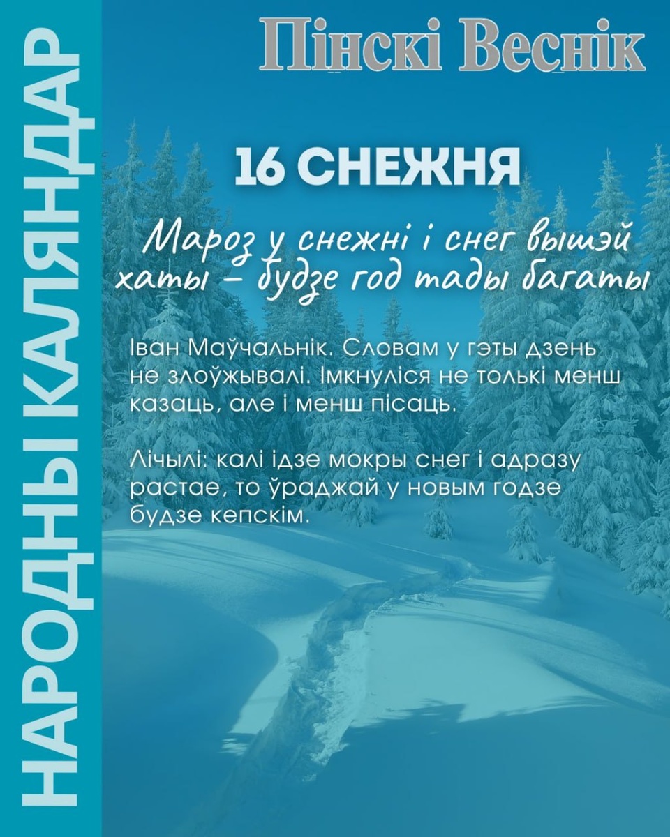 1️⃣1️⃣1️⃣1️⃣5️⃣1️⃣2️⃣ 1️⃣1️⃣1️⃣3️⃣1️⃣5️⃣1️⃣1️⃣ 📌16 снежня Іван Маўчальнік. Словам у гэты дзень не злоўжывалі. Імкнуліся не толькі менш казаць, але і менш пісаць. Лічылі: калі ідзе мокры снег і адразу растае, то ўраджай у новым годзе будзе кепскім. @Пинский Вестник 📱Ютуб 📱ВК 📱ИНСТАГРАМ 📱ОК 📱ФЕЙСБУК 📱ТИК ТОК Прислать новость