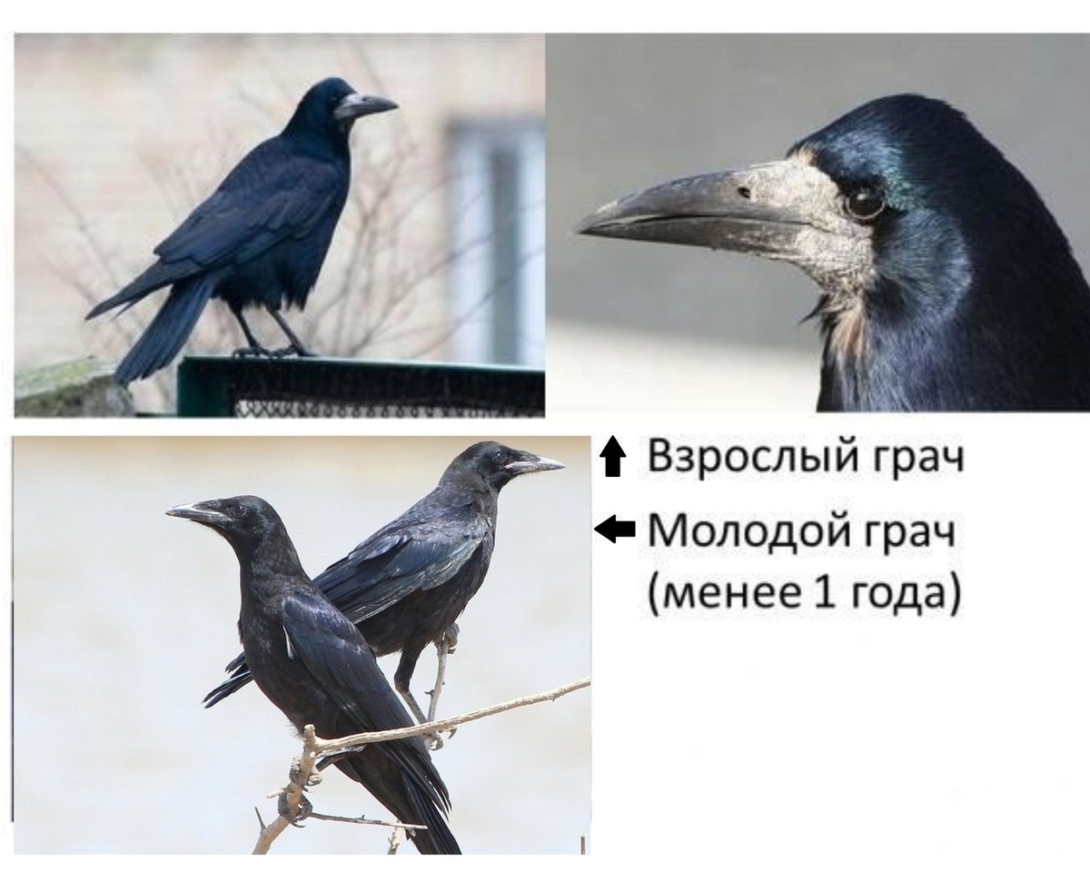 Их легко определить – нос у них лысый без перьев, кожа светлая. Молодые грачи до возраста 1 года имеют перья на носу.