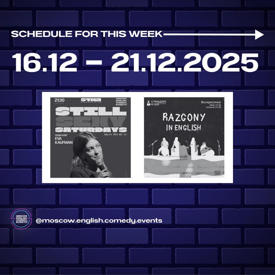 Schedule for this week (16.12 – 21.12)❗️ -----‐----------------------- 🕤Saturday, December 20th, 9:30 PM – Still Sexy Saturdays 🎤Open Mic 🎟Entrance: Pay what you want (any paper note or transfer) 💵 🔗 Register for free 🫰 pay upon arrival 📍Still StandUp Moscow 🗺 Pokrovka 17c5, through the arch with the pink lights 🏙 Blue building directly inside the courtyard -----‐----------------------- 🕠Sunday December 21st, 5:30 PM - Razgony in English 🍿Panel of comics riffs off each other's jokes and ideas 🎟️Entrance: FREE 💸 Food/drink purchase required 🥗 donations welcome 🔗Reserve for free 📍Stand Up Club на Трубной 🗺 Map: Rozhdestvensky Blvd, 10/7 С1