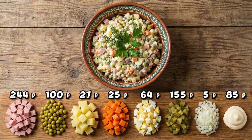 Уже по традиции в преддверии Нового года журналист «Перекрестка» прогулялся по белокалитвинским сетевым магазинам, чтобы рассчитать наш местный «индекс Оливье» — среднюю стоимость классического новогоднего салата на семью из четырех человек – и сравнить его с аналогичным в прошлом году. Как обычно, сразу отмечу, что наша задача – не найти самые дешевые или самые качественные ингредиенты. Так-то можно устроить ценовой разброс от 400 рублей (но это невозможно будет есть) до плюс бесконечности. Мы выводим именно «средний градус по палате» среди сетевых магазинов шаговой доступности, которые нагляднее всего демонстрируют ежегодный уровень инфляции и динамику роста цен на продукты массового потребления. Итак, получилось, что наиболее значимая позиция — 400 г. вареной колбасы, цена которой при средней стоимости 1300 руб. за кг составляет около 244 руб. Другие компоненты: 400 г. маринованных огурцов за 155 руб., 380 г. консервированного горошка — за 100 руб., 4 яйца — за 64 руб., 200 г. майон