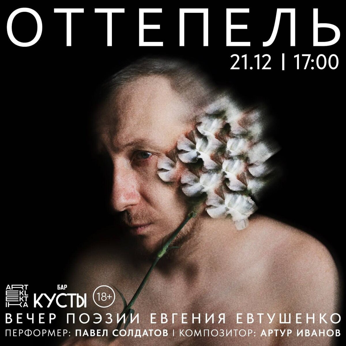 «Оттепель» | вечер поэзии Евгения Евтушенко 🗓️ 21 декабря, 17.00 📍бар Кусты, Федерации, 13 Павел Солдатов устроит иммерсивную перформанс-читку стихотворений Евгения Евтушенко под нойз/шугейз музыку Артура Иванова | 18+ Евгений Александрович Евтушенко (1932-2017) — великий русский поэт-шестидесятник, прозаик, режиссер, актер, публицист и общественный деятель, известный своими громкими стихами, выступлениями и гражданской позицией. С 1991 года жил и преподавал в США. Оставил после себя богатое литературное наследие, включая поэмы "Бабий Яр", "Станция Зима", и множество сборников стихов и прозы. Номинант на Нобелевскую премию за литературные достижения. 🏷Вход ~ свободные взносы Регистрация (всего 40 мест) #21декабря25@culturnik