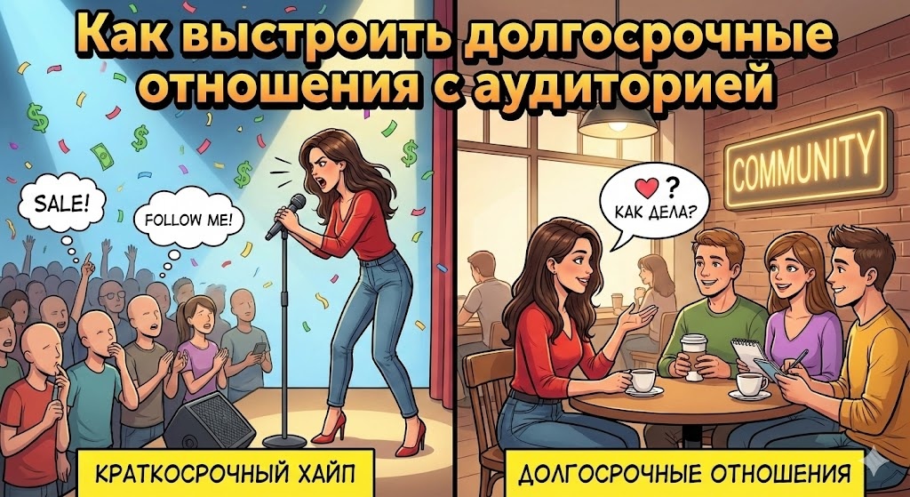 Долгосрочные отношения с аудиторией строятся не на одном вирусном посте, а на ощущении “я этого человека знаю, ему можно доверять, и он со мной надолго”. Исследования по сообществам и виртуальным инфлюенсерам показывают: ключевые факторы — понятная общая цель, стабильность, честность и регулярные живые взаимодействия, а не только красивый контент. Лояльность выше в тех сообществах, где у людей есть общая идея или цель, а не просто лента постов. Общая цель превращает аудиторию в сообщество, а не в случайных зрителей. Исследования по паразоциальным связям показывают: доверие растёт от стабильности образа и поведения, а не от идеальности. Когда автор резко меняет ценности, формат или “сегодня одно, завтра другое”, люди переживают это как маленькое предательство и уходят. Лояльность сильнее там, где люди связаны не только с автором, но и друг с другом. Исследования по сообществам показывают, что именно чувство принадлежности и взаимной поддержки делает аудиторию “липкой” на годы. Л