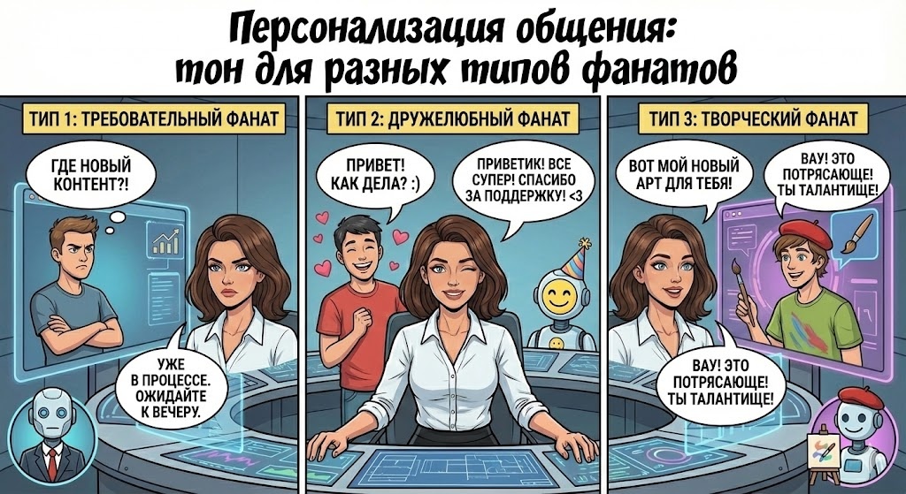 Персонализация общения с фанатами начинается с признания очевидного: разные люди ждут от тебя разного — кто‑то лёгкого внимания, кто‑то доступа “внутрь”, а кто‑то ощущения эксклюзивности. Исследования по фанатской экономике и платящим аудиториям показывают, что сегментация и тон общения под разные типы фанатов напрямую повышают лояльность и средний чек. Работы по экономике креаторов и платящей аудитории предлагают смотреть на фанатов слоями: новые, пассивные, активные и “киты” (самые крупные платящие). Когда тон общения подстроен под сегмент, фанаты чувствуют, что их понимают, а не “стреляют из пушки по воробьям”. Для тех, кто только пришёл: Исследования по подпискам показывают, что первые касания критичны: мягкое, понятное общение и отсутствие давления снижают риск быстрой отписки. Это люди, которые часто лайкают, пишут, иногда что‑то покупают. Гайды по фанатской психологии подчёркивают: именно признание и принадлежность превращают активного зрителя в платящего участника сообщест