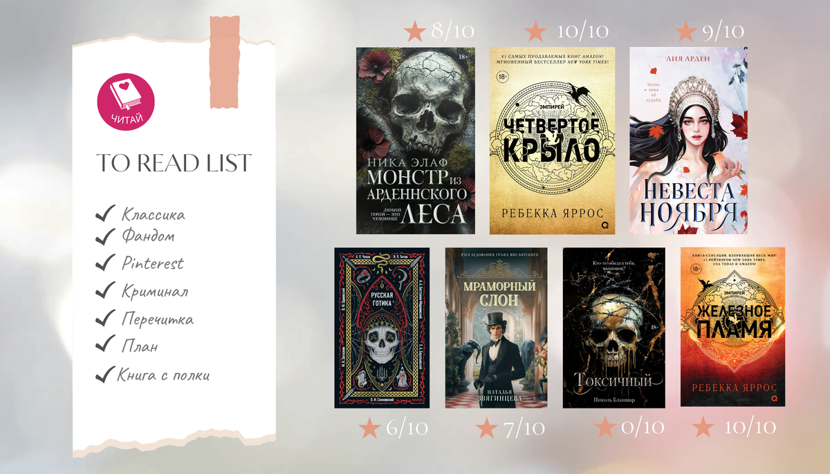Еще ни разу мой книжный челлендж не длился так долго. И дело совсем не в загруженности. Я решила разбавить его прекрасным аудиосериалом по "Эмпирей", а потому дело затянулось аж до середины декабря. Но, слава богу, я успела все закончить до конца года. Итак, мои результаты и мнение об историях после того, как первые эмоции схлынули. 1. Монстр из Арденнского леса Крутая вещь. Написана очень вкусно, захватывающе, атмосферно. Я получала огромнейшее удовольствие от чтения, буквально испытывая те чувства, что терзали героев. Автор просто невероятна! Погружение в сюжет 100%, детектив круто закручен, и я с нетерпением жду, когда в моих руках окажется продолжение. 2-3. Четвертое крыло и Железный шторм Иногда книгам нужно давать второй шанс. Иногда лучше слушать, чем читать. Последнее стало для меня настоящим открытием. Если в первый раз книга абсолютно мне не понравилась, то с тех пор, как я начала слушать аудиосериал, я просто живу в этой вселенной. Сегодня по дороге на работу я слушала