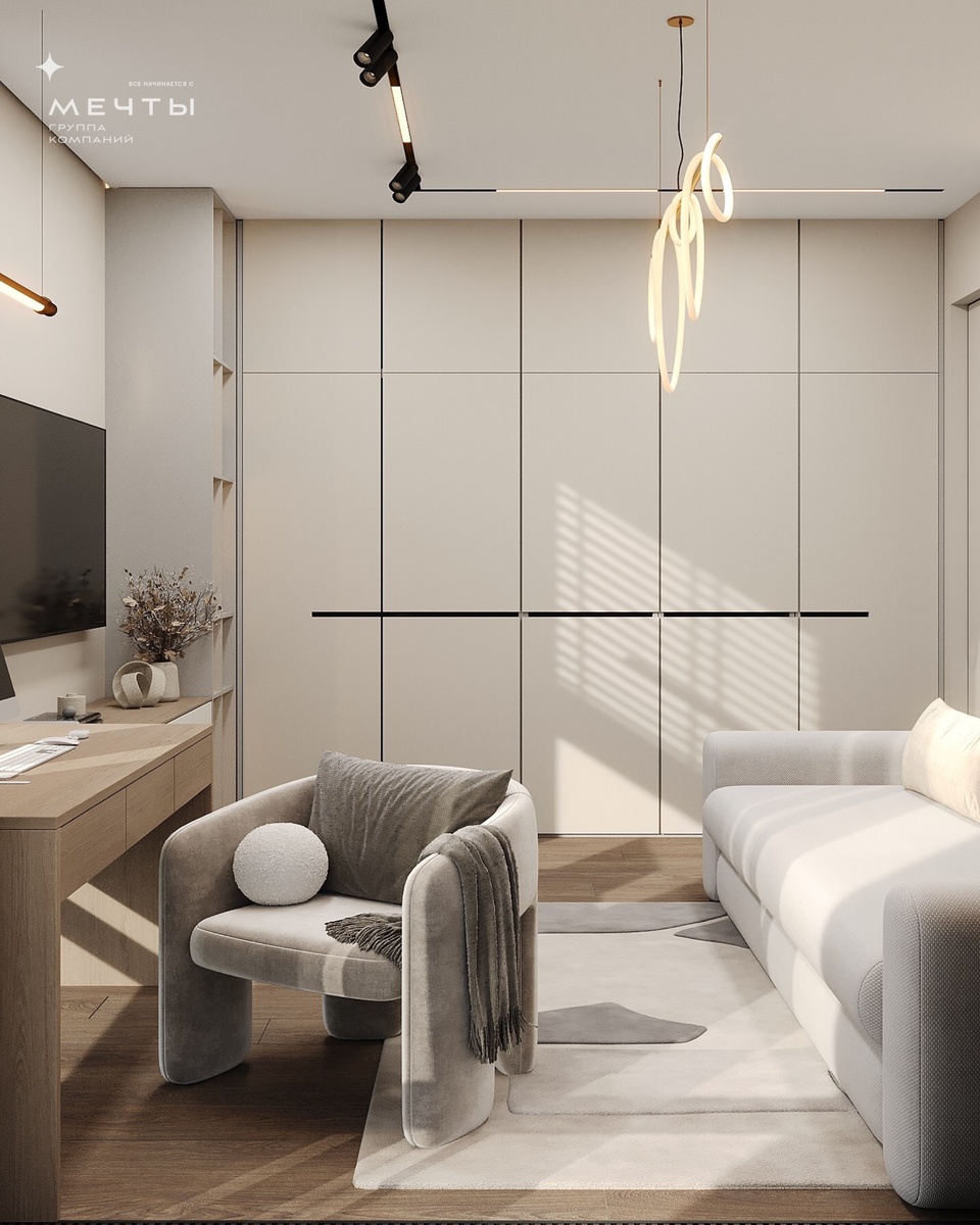 Для перерывов и смены фокуса предусмотрены диван и ТВ, а встроенный шкаф обеспечивает достаточный объём хранения, не перегружая интерьер.
