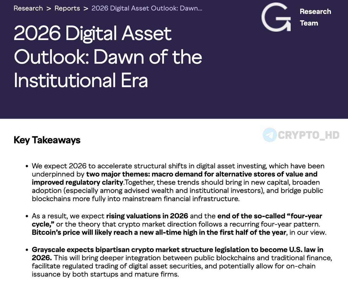 🔮 В Grayscale опубликовали прогнозы на 2026 год – original ▪Общий прогноз. ➤ 2026 год станет началом полноценной институциональной эры крипторынка. ➤ Ожидается рост оценок цифровых активов и завершение концепции «четырехлетнего цикла». ➤ Биткоин способен обновить исторический максимум в первой половине 2026 года. ▪Макроэкономика и деньги. ➤ Рост госдолга и фискальные риски усиливают спрос на альтернативные средства сбережения. ➤ BTC и ETH рассматриваются как дефицитные цифровые денежные активы. ➤ 20-миллионный Биткоин будет добыт в марте 2026 года, что усиливает нарратив дефицита. ➤ Приватные монеты, такие как Zcash (#ZEC), могут выиграть на фоне валютных рисков. ▪Регулирование. ➤ В 2026 году ожидается принятие двухпартийного закона США о рыночной структуре криптоиндустрии (CLARITY). ➤ Регуляторная ясность ускорит приток институционального капитала. ➤ Появится возможность регулируемого ончейн-выпуска активов для компаний. ➤ Провал законодательного процесса рассматривается как ключе