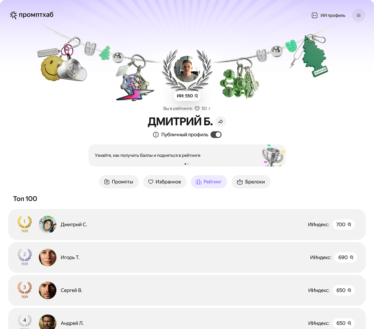 Россияне смогут следить за улучшением своих навыков работы с нейросетями с помощью специального рейтинга. Он появится на Промптхабе – платформе с готовыми идеями, как применять ИИ. Скоро пользователи смогут не только выбирать на платформе промпты, проходить курсы и участвовать в челленджах, но и соревноваться за место в рейтинге, которое зависит от личного ИИндекса. Об этом команда Промптхаба рассказала во время церемонии «Ночь промптов». ИИндекс есть у каждого пользователя Яндекса: он показывает, насколько активно человек осваивает нейросети. ИИндекс и рейтинг превращают промптинг в увлекательное занятие, чтобы как можно больше людей научились решать свои задачи с помощью нейросетей. Для того чтобы повысить ИИндекс и место в рейтинге, нужно чаще обращаться к Алисе AI, добавлять на Промптхаб свои идеи и собирать лайки, тестировать промпты других авторов, участвовать в челленджах и проходить курсы по работе с ИИ. В топе лидеров рейтинга окажутся самые любознательные – те, кто находит но