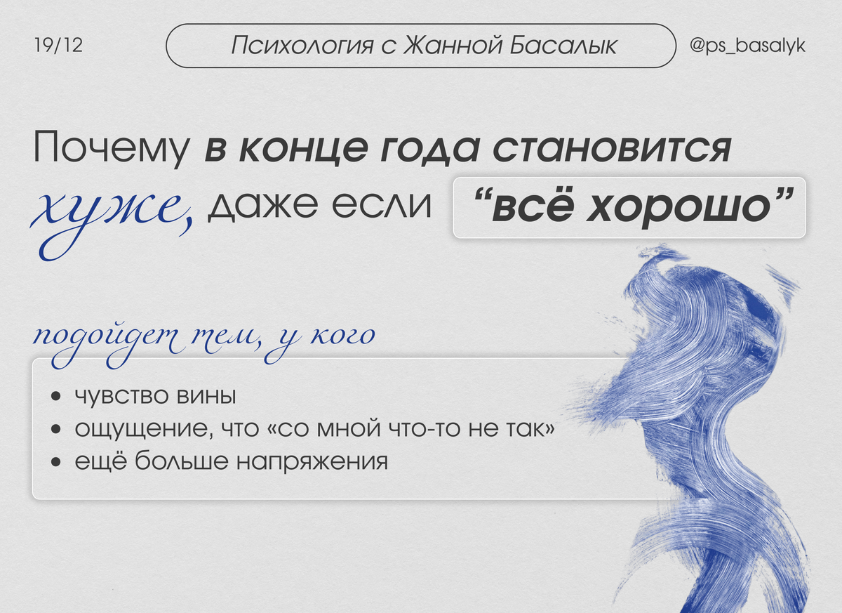 «Вроде всё нормально, но радости нет» В течение года мы живём в режиме: Но нервная система не бесконечна, и к декабрю: И когда контроль ослабевает, тело и психика дают сигнал усталости. Пока есть угроза — мы мобилизованы, а вот когда внешне всё стабильно — защита снижается, и наружу выходят: Поэтому состояние ухудшается не в кризис, а после него. Декабрь усиливает тревогу из-за навязанных установок: «нужно радоваться» «год должен быть успешным» «надо подводить итоги и строить