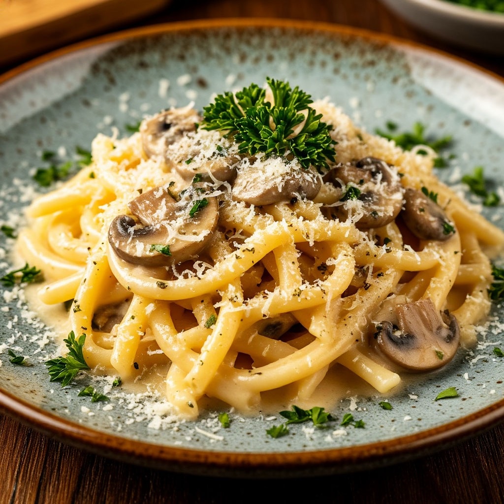 Предлагаю рецепт изысканной пасты с шампиньонами и трюфельным маслом. Нежные грибы в сочетании с ароматным трюфельным маслом превращают простое блюдо в кулинарное откровение. Готовится легко, а эффект — как из мишленовского меню! Почему этот рецепт стоит попробовать: всего 25 минут на приготовление; минимум ингредиентов — максимум вкуса; эффектная подача подойдёт для романтического ужина; трюфельное масло добавляет блюду благородный, насыщенный аромат; легко масштабируется под любое количество гостей. Ингредиенты (на 2 порции) паста (лингвини/спагетти/феттучини) — 200 г; шампиньоны свежие — 150 г; масло оливковое — 2 ст. л.; чеснок — 2 зубчика; лук репчатый (маленький) — 1 шт.; белое сухое вино — 50 мл (опционально); сливки 20 % — 100 мл; сыр пармезан (тёртый) — 30 г; трюфельное масло — 1 ч. л.; соль — по вкусу; перец чёрный молотый — по вкусу; зелень свежая (петрушка/базилик) — для подачи. Пошаговый рецепт Подготовка ингредиентов: