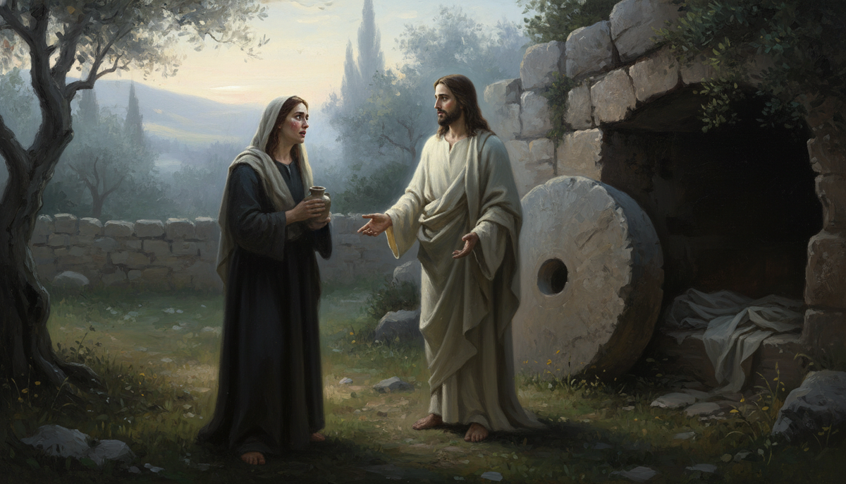 В этот момент к ней подходит мужчина. Спрашивает, почему она плачет. Мария принимает его за садовника — рядом был сад Иосифа Аримафейского, который предоставил свою гробницу для погребения.