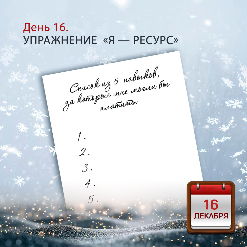 Упражнение «Я — РЕСУРС» . Задание: составь список из 5 навыков, за которые тебе бы могли платить. Напиши один навык в комментариях. Предыдущие публикации по этой теме смотрите на канале.