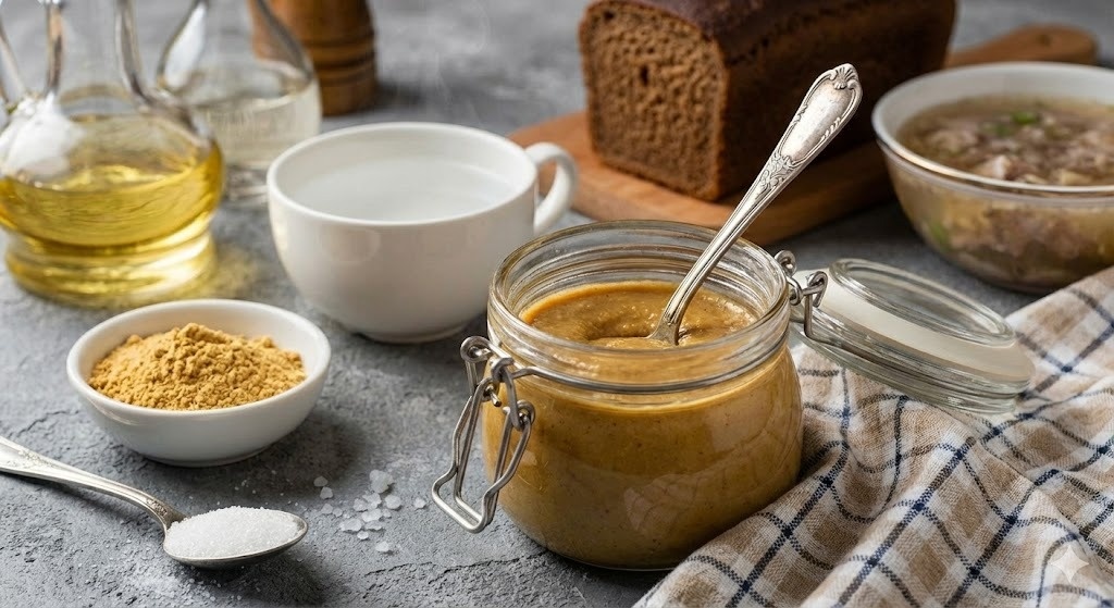 Честно скажу, сейчас я готовлю её не часто — в моей семье горчицу не очень любят и едят мало. Но этот рецепт я храню бережно. Папа всегда смешивал всё «на глазок», интуитивно чувствуя консистенцию. Но однажды я всё-таки записала с его слов примерные пропорции, чтобы не забыть. Делюсь папиным рецептом: В чистую баночку насыпаем горчичный порошок. Добавляем соль и сахар, перемешиваем. Начинаем понемногу вливать горячую воду (около 60°C). Важно: не заливайте кипятком, иначе горчица будет горчить и потеряет остроту. Вливаем и постоянно мешаем, пока не получим консистенцию густой сметаны. Комочков быть не должно! Добавляем растительное масло и уксус, еще раз хорошо перемешиваем. Самый главный секрет папы: закрываем банку крышкой, заворачиваем её в кухонное полотенце и ставим в теплое место (н