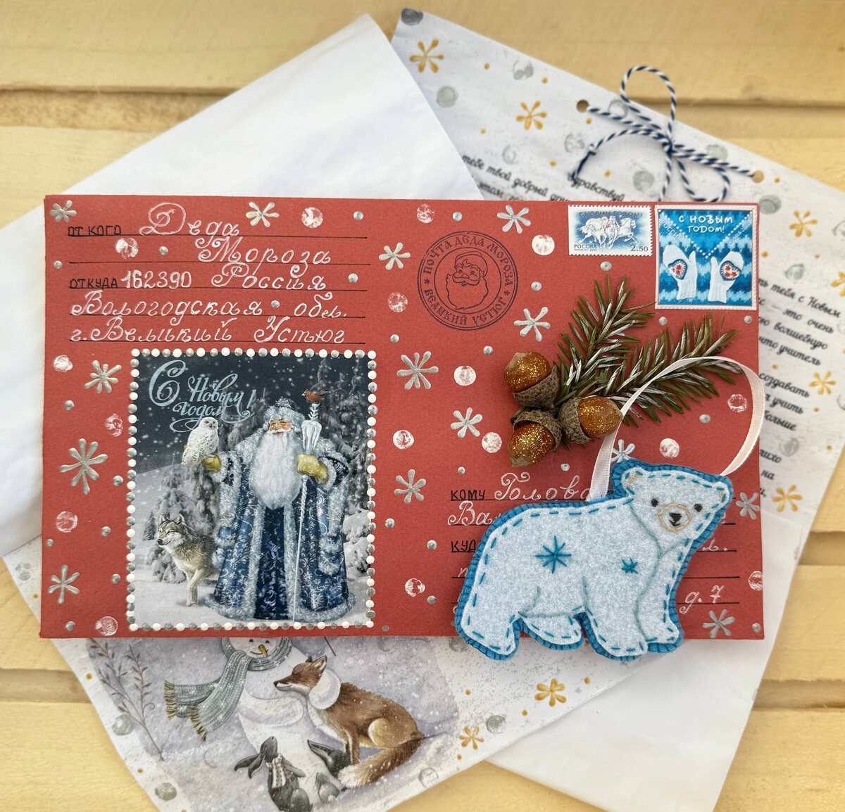 🤩 Вчера к дружным братьям в Ростовскую область отправилось письмо от Деда Мороза. 🤩 У ребят уже целая коллекция писем от нашей сказочной канцелярии так, как весточки они получают от Дедушки Мороза ежегодно на протяжении нескольких лет) Для нас это особая награда, когда знаешь, что, где-то на другом конце нашей красивой страны ждут послание от самого доброго кудесника на свете - Деда Мороза) 🤩 Как правило ребята, которые ждут ответное письмо от зимнего волшебника, несомненно, чем-то увлечены, помимо учебы. Вот и в данном случае радостно от того, что братья продолжают заниматься MMA, а также тренируются на трюковых самокатах, а еще освоили езду на квадроциклах. Хочется отметить, что находят они время и для изучения английского языка, средний брат увлечен рисованием, а старший осваивает игру на гитаре. 🤩 Конверт цвета утренней зари декорирован тремя золотистыми орешками и изящной еловой ветвью, комплект полностью пропитан ароматом сочного апельсина, дополнением к письму идет елочна