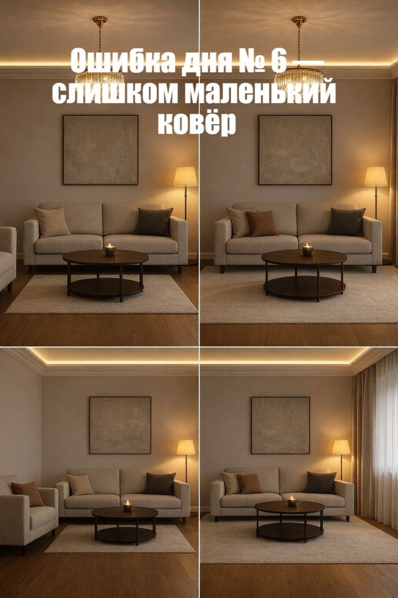❌ Ошибка дня № 6 — слишком маленький ковёр Если ковёр меньше зоны с мебелью, интерьер выглядит разрозненным и визуально более дешёвым, даже если сама мебель качественная и дорогая. 🧩 В чём проблема • мебель «разваливается» по комнате • пространство теряет целостность • ковёр выглядит случайным элементом • пропадает ощущение масштаба Маленький ковёр подчёркивает ошибки планировки. ✅ Как сделать правильно В продуманном интерьере ковёр объединяет зону: — ковёр должен заходить под диван и кресла минимум на 20–30 см — в гостиной вся группа мебели стоит на ковре или частично на нём — форма ковра поддерживает геометрию пространства — цвет и фактура усиливают стиль, а не противоречат ему Комната выглядит собранной, пропорциональной и визуально более дорогой. Возникает ощущение завершённого дизайнерского решения. Ковёр — это не декор. Это инструмент масштабирования. #ошибкадня #дизайнинтерьера #коврывинтерьере #премиальныйинтерьер #советыдизайнера