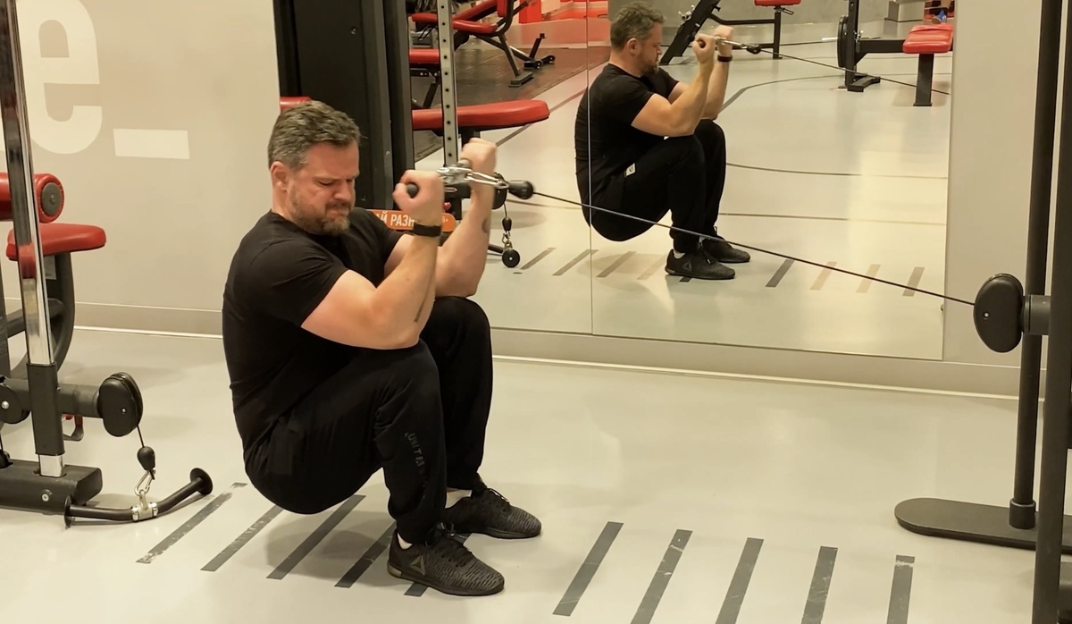 Упражнение, о котором я сейчас расскажу, весьма своеобразное. Называется "Сгибание на бицепс в стиле Бирюлево". Упражнение это знаю очень давно. Ну а название я придумал сам, чтобы как-то вообще его называть. Выполняется следующим образом. Берем вес, садимся на корточки, упираемся локтями себе в колени и акцентированно сгибаем предплечье, тренируя бицепс. Преимущество этого упражнения в том, что абсолютно исключаем любой читинг. То есть мы работаем исключительно бицепсом. И никакая другая мышца нам здесь не может помочь.