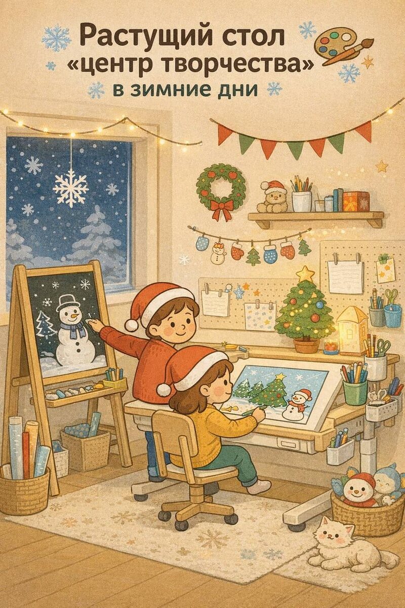 Зимой дети проводят больше времени дома, а значит особенно важно создать пространство, где можно не только учиться, но и творить, играть и фантазировать. Растущий стол легко становится настоящим центром притяжения для ребёнка — местом, где каждый день происходит что-то новое. ✨ Почему именно растущий стол? 🔹 Подстраивается под ребёнка Регулируемая высота позволяет удобно сидеть и малышу, и ребёнку постарше. Комфортная посадка = больше времени за любимыми занятиями без усталости. 🔹 Идеален для зимнего творчества За одним столом можно: — рисовать зимние пейзажи и снежинки, — лепить из пластилина и теста, — вырезать украшения и гирлянды, — раскрашивать новогодние раскраски, — писать письма Деду Морозу 🎅 🔹 Порядок без усилий Контейнеры и полочки помогают хранить карандаши, краски, бумагу и поделки под рукой. Ребёнок сам учится наводить порядок после творчества. 🔹 Мольберт и доска — бесконечные идеи Грифельная доска или мольберт превращают обычный день в игру: можно рисовать, стирать и