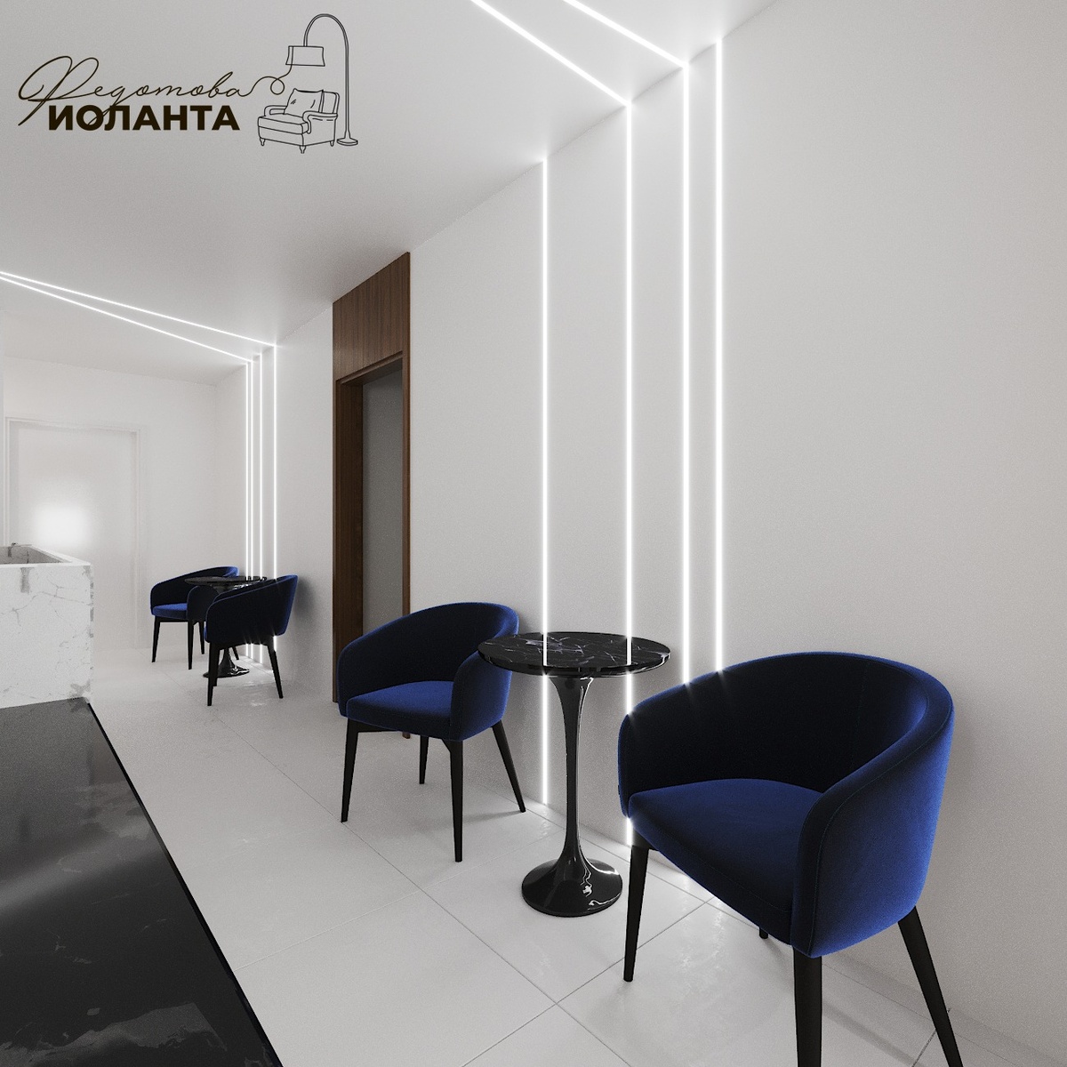 Проект клиники «Культура улыбки» для меня особенный ещё и потому, что он развивался в два этапа. 🔹 В 2020 году мы сделали первую часть помещения: тогда задача стояла запустить пространство быстро и функционально, но при этом с комфортом и настроением, чтобы пациенты чувствовали себя спокойно. 🔹 В 2025 году клиника расширилась, арендовала соседнее помещение — и я снова подключилась к проекту. В итоге мы создали цельный интерьер, который выглядит единым организмом, современным и атмосферным. С самого начала я хотела уйти от ассоциации с «стерильной больницей», где всё белое и холодное. В «Культуре улыбки» появилось дерево, благородные фактуры камня, выразительные акценты. Здесь важно не только соблюсти медицинские нормы, но и создать атмосферу доверия — потому что пациент приходит в клинику не за дизайном, а за комфортом и спокойствием. Кресла в зоне ожидания стали отдельной историей. Мы пробовали разные варианты, опираясь на бренд-бук, где изначально палитра была пастельной. В га