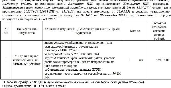 Название: Лот№7 1/80 доли в праве собственности на земельный участок земли сельскохозяйственного назначения - для сельскохозяйственного производстваплощвдь - 2480372 кв.м. кадастровый номер- 22:01:000000:964 адрес: Алтайский край, Алейский район, участок расположен примерно в 2 км по направлению на юго-запад от п. Бориха Нач..цена 45887 руб. (согласно выписке ЕГРН, должник Устинович Н .И., ограничения: арест, запрет на рег.действия, ст. 56 ЗК РФ) (1626) Канал: Госземля Алтайский край Область: край Алтайский Алтайский край Район: Алейский район Населенный пункт: участок расположен примерно в 2 км по направлению на юго-запад от п. Бориха Локация: Смотреть на карте ВРИ: Земельные участки общего назначения Кадастровый номер: 22:01:000000:964 Кадастровая стоимость: - Вид сделки: Продажа Площадь: 2480372 м² Начальная цена: 45887.00 руб. Дата завершения: 12.01.2026 Подробнее: ГИС ТОРГИ #госземля #земляотгосударства #земля #земельныйучасток #земельныеторги #торги #аукцион #продажаземли #прода