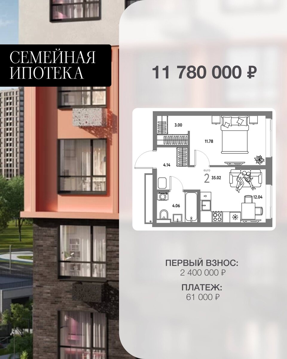Первый взнос: 2 400 000 ₽ Платёж: 61 000 ₽