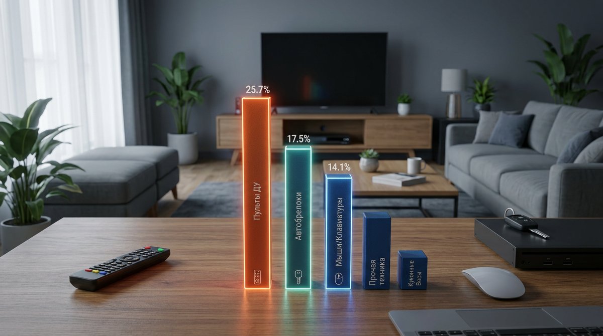 Сценарии отказов. По 206 реальным историям из открытых ответов чаще всего подводят пульты и автобрелоки, далее мышь/клавиатура, кухонные весы и детские игрушки (проценты ниже):