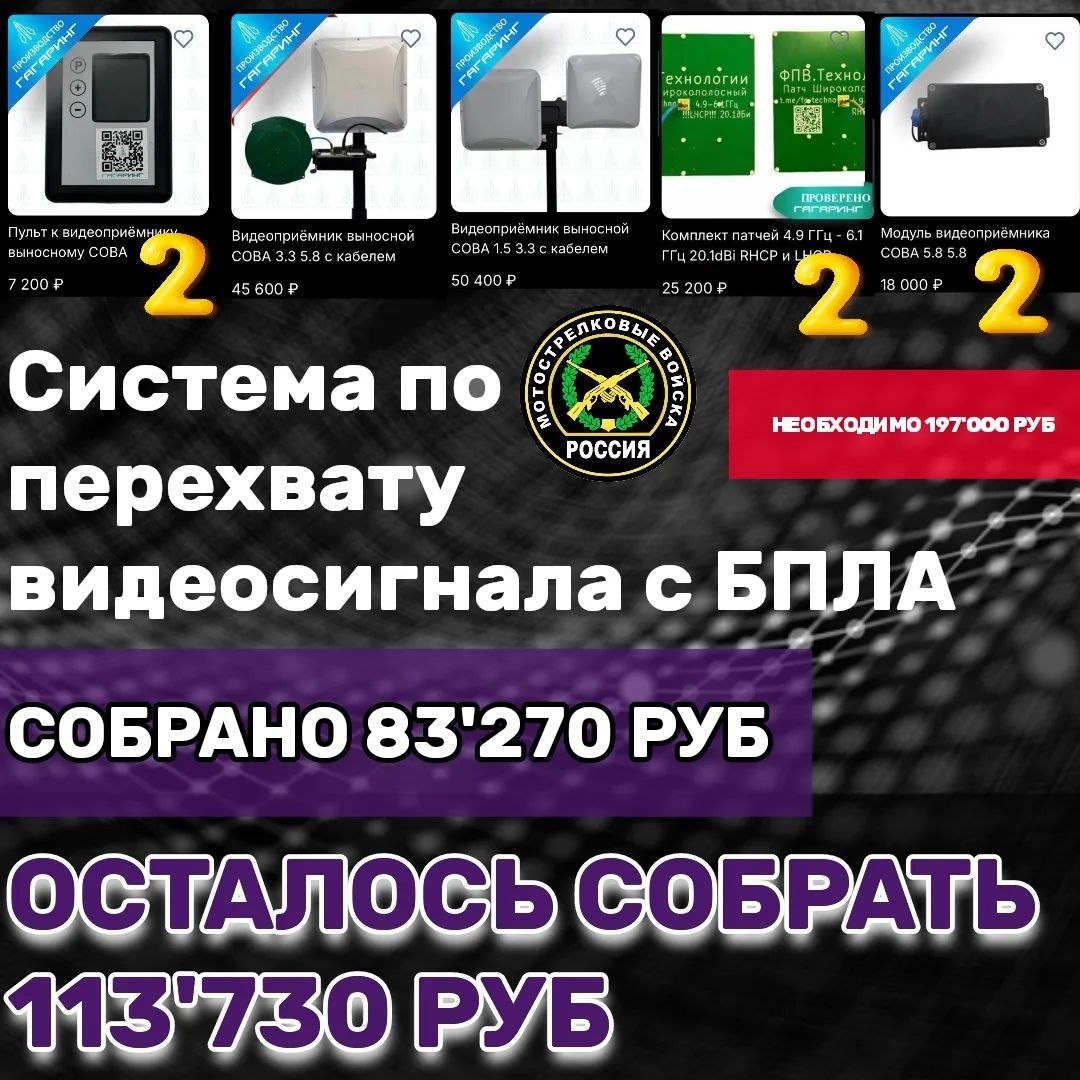 Берегите себя, дорогие тыловики, и своих близких.. Здоровья всем.. 🙏 Продолжаем сбор на "СОВУ" - оборудование, необходимое для воздушной разведки. 📌Сумма к сбору - 197'000 🔺Собрано - 83'270 руб. 🔺Осталось собрать - 113'730 руб. ❗️Друзья, размещайте, пожалуйста, посты в соцсетях, в статусах - дело пойдёт быстрее❗️ Важно - привлекать новых людей. Тогда быстрее будем выполнять задачи!😊🙏 #вместемысправимся #вместемысила Любую посильную сумму можно совершить по номеру карты 💳2202208188194204 или по номеру телефона 📞+79530562233 Получатель - Светлана Владимировна Л. ("Сбербанк"). *Оборудование будем заказывать у производителя после 100% предоплаты. Срок изготовления - 45 дней ‼️