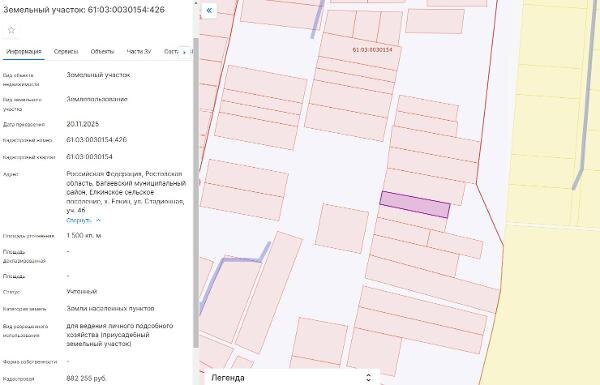 Название: Земельный участок с кадастровым номером 61:03:0030154:426 площадь 1500 по адресу Российская Федерация, Ростовская область, Багаевский муниципальный район, Елкинское сельское поселение, х. Елкин, ул. Стадионная, уч. 4б Канал: Госземля Ростовская область Область: обл Ростовская Российская Федерация Район: Ростовская область Населенный пункт: Багаевский муниципальный район, Елкинское сельское поселение, х. Елкин, ул. Стадионная, уч. 4б Локация: Смотреть на карте ВРИ: Для ведения личного подсобного хозяйства (приусадебный земельный участок) Кадастровый номер: 61:03:0030154:426 Кадастровая стоимость: - Вид сделки: Аренда Площадь: 1500 м² Начальная цена: - руб. Дата завершения: 16.01.2026 Подробнее: ГИС ТОРГИ #госземля #земляотгосударства #земля #земельныйучасток #земельныеторги #торги #аукцион #арендаземли #аренда #ростовскаяобласть