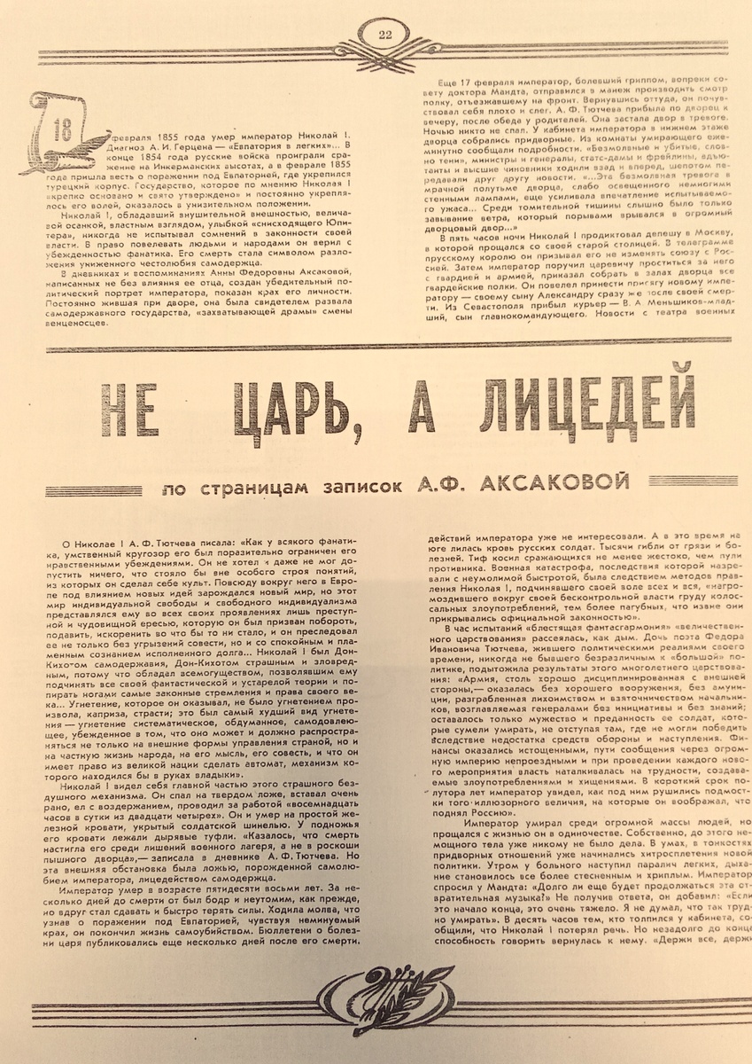 В дневниках и воспоминаниях Анны Федоровны Аксаковой, написанных не без влияния ее отца, создан убедительный политический портрет императора, показан крах его личности. Постоянно жившая при дворе, она была свидетелем развала самодержавного государства, «захватывающей драмы» смены венценосцев.